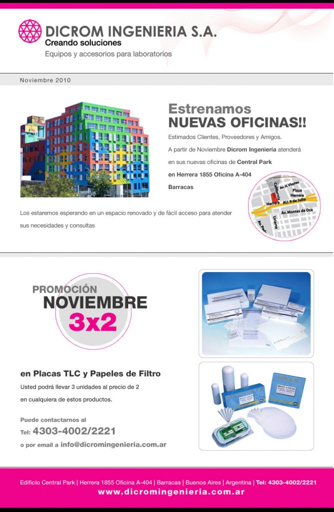 El primer envío se realiza durante noviembre e informa acerca de la mudanza de las oficinas de Dicrom al edificio Central Park.